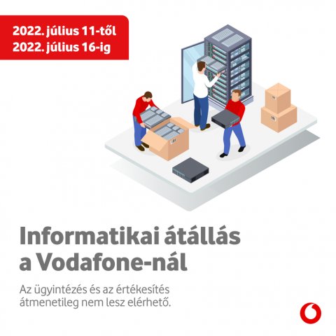 A hatékonyabb, egységesebb ügyfélkiszolgálás érdekében a Vodafone Magyarország július 11-16. között informatikai átállást végez, ez idő alatt az online és személyes ügyintézés, értékesítés, valamint egyes speciális szolgáltatások (például mobilvásárlás – autópályamatrica, parkolás) nem lesznek elérhetőek.