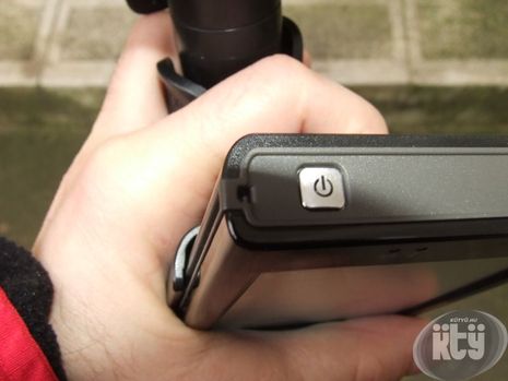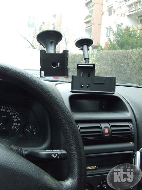 A tartóba helyezett készüléket "cuppantottam" fel, de a készülék kivételénél elkapott a röhögő görcs. A képen is látszik (a bekapcsoló gomb tükröződik a szélvédőn), hogy ebben a pozícióban nem lehet kivenni a készüléket a tartó elmozdítása nélkül!