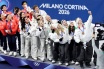 Az Egyesült Államok aranyérmesei, Japán ezüstérmesei és Olaszország bronzérmesei pózolnak egy Győzelmi szelfihez a műkorcsolya csapatverseny után. (Fotó: Andreas Rentz / Getty Images)