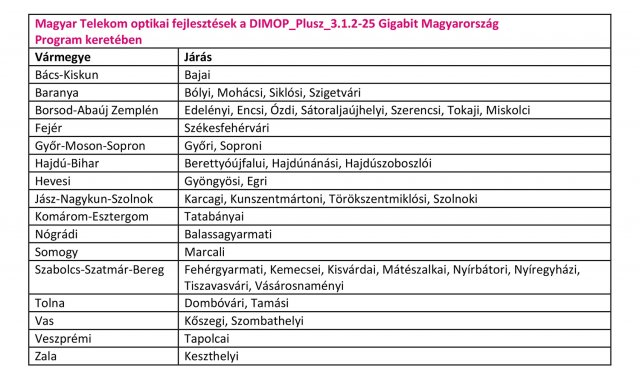 A Magyar Telekom az Európai Unió által támogatott DIMOP Plusz 3.1.2-25 „Gigabit Magyarország Program” keretében korszerű optikai hálózatot épít ki 16 vármegye 41 járásában. A vállalat a Program 1–2. pályázati szakaszában 20,319 milliárd forint vissza nem térítendő támogatást nyert el, amelynek köszönhetően az idei évben több mint 500 településen indítja el azoknak a területeknek a gigabites optikai lefedését, ahol eddig nem volt elérhető ilyen infrastruktúra.