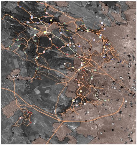 A Budai-hegység úthálózata turistautak.hu webes térképén. A két végpont közötti legrövidebb útvonal halványsárga színnel jelenik meg.