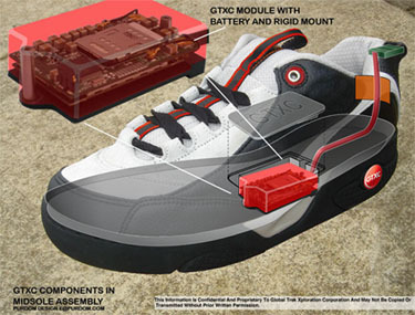 A GTX Corporation bemutatja újabb beépített GPS nyomkövetővel ellátott cipő-sorozatát. Ha tudni szeretnénk, merre jár csemeténk, esetleg idős rokonunk, csak vegyünk neki egy ilyen lábbelit és máris követhetjük minden lépését.