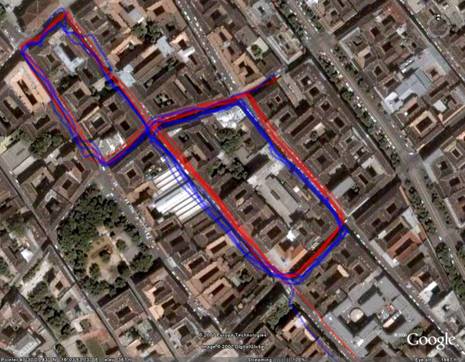 Az ábrán kék színnel az Antaris, pirossal a Sirf III vevő nyomvonala látható. A tesztet a már ismert, VII kerületi szűk, sikátoros részen végeztük el. A képen jól látható, hogy ugyan derekasan küzdött az Antaris, azért a Sirf III nem véletlenül az egyik, ha nem a legkedveltebb lapkakészlet a mai GPS vevőkben, egyértelműen sokkal pontosabb és stabilabb volt.