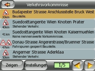 Sajnos a konkrét példánkban nem kellett túl sok bejegyzést ellenőrizni, Bécs területén mindössze 3, azaz három élő információ szerepelt, nevezetesen egy útépítés, egy torlódás és egy lezárt útszakasz. Ebből ráadásul az első kettő téves riasztásnak bizonyolt, a valóságban egyik sem létezett. A harmadik szerencsére igen, itt építkezés miatt zártak le egy utcát, amit az iGO-klón MioMap szépen el is került tervezéskor. Ezzel együtt megdöbbentően kevés ez a 3 (ebből 2 téves) TMC-üzenet egy ekkora városban.