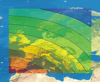 Egy Európát jórészt lefedo, a 70°É, 35°É, -10°Ny és 35°K ívek által határolt területre a domborzat és a tereptárgyak figyelmebevétele nélkül, állandó, 150 méteres ellipszoid feletti magasságra vonatkozóan elkészítettem az egyes muholdak magassági szögének izovonalas térképét.