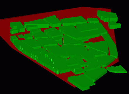 A láthatósági vizsgálathoz használt szoftver képes a domborzatmodellen elhelyezett, magassági attribútummal rendelkezo vektoros elemek kitakaró hatásának figyelembevételére. A kapott állományt nem tudtam közvetlenül beolvasni, és egy utca kimaradása miatt amúgy is javítani kellett volna a modellen, így újra rajzoltam azt. A bevitel az eredeti 3D tömbök síkvetülete alapján történt, figyelembe véve az 1:10 000 méretarányú EOTR topográfiai térkép tömbhatárait is. Az egyes háztömbök tetejének tengerszint feletti magasságát a DGN állomány alapján adtam meg. Az utcák szintjének egy állandó, 108 m-es magasságú "domborzatmodellt" alkalmaztam, ahogyan az a 3D modellben is szerepelt.