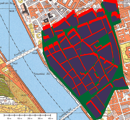 Az épített környezet kitakaró hatását Budapest belvárosában, a Duna - Kossuth Lajos utca - Múzeum körút - Vámház körút által határolt területen vizsgáltam. Alapanyagként rendelkezésemre állt egy 3D vektoros háztömbmodell Microstation DGN formátumban, EOV rendszerben, amely a BME Fotogrammetria és Térinformatika Tanszékén készült a 2000. évi országos légifényképezésbol származó sztereopárok fotogrammetriai kiértékelésével (11. ábra).