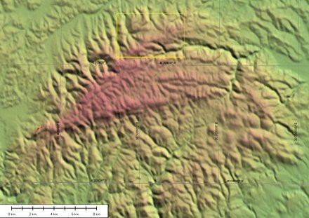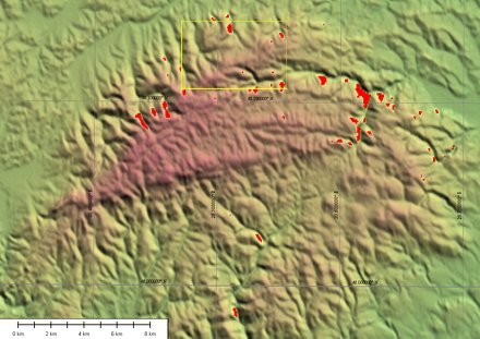 7. ábra. Az (áthelyezett) ARTEMIS muhold láthatósága a Bükkben, SRTM domborzati adatokkal. A piros területeken a muhold a domborzat takarásában van. A 7. ábra helyét a sárga keret mutatja.
