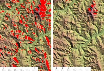 6. ábra. Balra az AOR-E, jobbra az ARTEMIS muhold láthatósága az erdélyi mintaterületen, SRTM domborzati adatokkal. A piros területeken a muhold a domborzat takarásában van. A képek bal alsó részeire esik a Gyilkos-tó, jobb fölso sarkokban pedig a Csalhó tömbje látható.