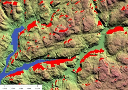 Az elso mintaterület Dél-Norvégiában van a 60. szélességi kör alatt valamivel, egy erosen tagolt, fjordos vidéken. 3 fokmásodperces cellaméretu (90-60 m) SRTM domborzatmodellt használtam, és csak az ARTEMIS muholdra számoltam láthatóságot (5. ábra). 1/500-ad részére csökkentettem a muhold-vevo vektor hosszát, amely így közel 79 km hosszúságú volt.