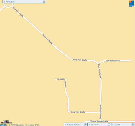 a térképen. A Google Earth böngészoben (lásd fenn) és a map24.com Tele Atlas térképeket tartalmazó keresojében (lásd lenn) egyaránt megtalálható a Gyula-Horn-Straße, ám egyik szakaszán mindkét adatbázisban tévesen, Gyla kezdettel szerepel.