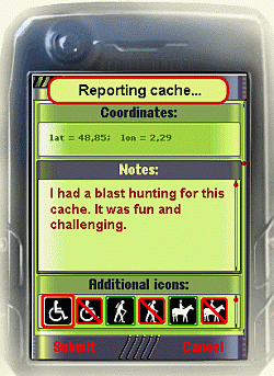 A program a fentiek mellett a geocaching uzésében is segít: funkciói a közeli ládák keresése, a pontra navigálás, valamint a megtalálások és elrejtések szöveges és fényképes bejelentése. (Megjegyezzük, hogy hasonló geocaching-funkciókat már itthon is elérhetünk - igaz, hogy csak WAP-on és csupán cella alapú helymeghatározással.)