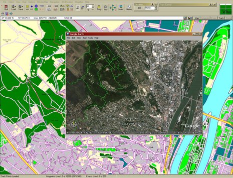 - Az ingyenes Google Earth böngésző .kml kiterjesztésu natív formátumával vektoros adatok, formázások és raszteres fedvények vihetok a hálózatról letöltodo térképek és muholdfelvételek fölé. Az OziExplorer egyrészt képes olvasni és írni az olyan .kml fájlokat, amelyek pontokat és poligonokat (track-eket) tartalmaznak. Másrészt az aktuális térképablak területe a betöltött adatokkal vagy anélkül gombnyomásra (Save > Export to Google Earth menübol, vagy az eszköztárra helyezett saját ikonjával) megnyitható a Google Earth böngészoben. (Itt csak bizonyos területekre adottak a méter alatti felbontású felvételek, 15 m-es felbontású urfelvételek viszont mindenütt vannak, ezért az Ozi-ból indítva mindig 10 km magasról nézve nyílik meg a böngészo, Budapesten innen lehet tovább zoomolni.)