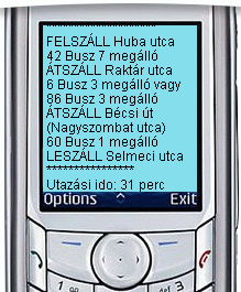 lehet igénybe venni. Az útvonalterv kétféle formátumban kérheto. MMS fogadására nem alkalmas készülékkel is használható az SMS formájában érkezo tömegközlekedési útvonalajánló. Ekkor a térkép nélküli, szöveges itiner Budapest és környéke BKV járatainak segítségével igazít el minket a 160 Ft + ÁFA díjú SMS-ben megadott kiindulási- és célpont között.