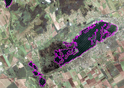 Vízfelület-kontúrok a Velencei-tó muholdképén. A nádassal borított részek jól elkülönülnek a szabad vízfelülettol.
