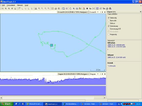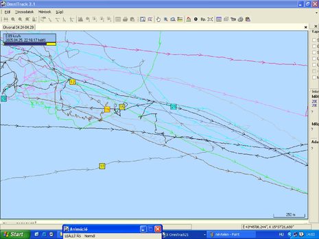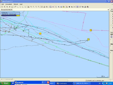 Aber auch aus den Daten der anderen Logs konnte der Vorfall rekonstruiert werden. Man sieht auf den Diagrammen sehr schoen die abgefahrenen Strecken, getrennt in Segel- und Motorantrieb, gut sichtbar auch die Spurwechsel des Teilnehmerfeldes zum Unfallzeitpunkt. Das Boot, von dem aus als erstes das Kentern bemerkt wurde, kehrte als erstes um um zu helfen. Das Boot sank sofort, kann also nicht allzuweit abgetrieben worden sein. Wir wissen auch, dass die Mannschaft von 3 Schiffen gerettet wurde. Auch wurde die MOB (Man over Board) Funktion auf allen dreien ausgeloest. Unter Beruecksichtigung der Stroemung wurden die Geretteten zwar zu verschiedenen Zeitpunkten aber defacto am selben Ort aus dem Wasser gezogen. So koennen die Koordinaten aus dem Track Log abgelesen werden.