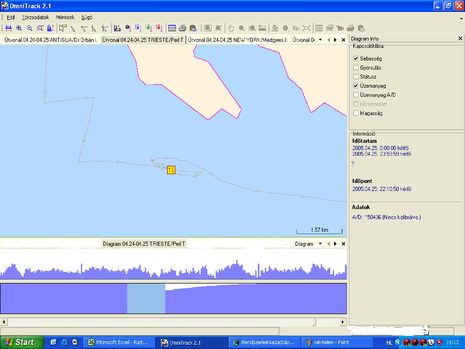 Die Linie der TRIESTE zeigt, dass sie in einem kompliziertn Manoever den Motor um 22.11