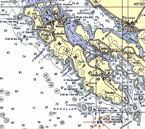 Meiner Meinung nach brach der Kiel irgendwo im Umkreis von 200m bei N 43º 45’ 00” O 015º 38’ 19” ab. Also mindestens 800m von den Kukuljar-Untiefen unter Murter im offenen Meer, so dass daher praktisch die Kollision mit einem Felsen ausgeschlossen werden kann.
