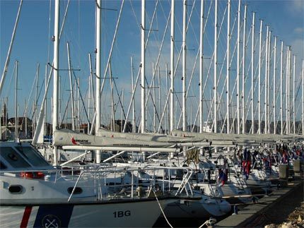 4 PM on the 25th of April. The field, which is in race since the morning hours is cruising south-easterly in the tube defined by Pasman and Kornat islands. The strong near wind and the billows mean a serious, but not extreme challenge both for the boats and the crews. The first serious technical problems occur. We can see on the picture that the SAINT TROPEZ / captain Gyula Szécsényi having a problem in the steering mechanism makes a responsible decision: they give up the race and they are in course to Zadar – Biograd. (The arrows show the direction of the boats.)