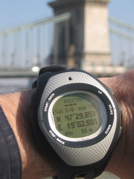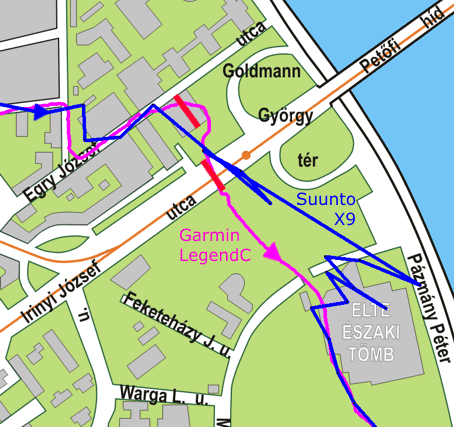 A trackek összehasonlítására Garmin eTrex Legend C vevot használtunk. Nyílt terepen a két készülék által adott pozíció szépen fedte egymást. A rosszabb vételi körülmények esetén jelentkezo különbségeket szemlélteti az alábbi ábra. Az órát természetesen nem városi használatra tervezték, ám itt a korlátozó tényezok térbeli elhelyezkedése és azok hatása sokkal jobban körülhatárolható. Magas házakkal beépített területen a Legend C jobban teljesít, de az X9 is nagyjából követi a kanyarokat. A Goldmann György térnél egy fedett átjárón és egy aluljárón kellett áthaladni. A ketto között, illetve az ezt követo nyílt területen a Legend C hamar "visszatalált" a helyes útra, míg a Suunto készüléke csak késobb, az ELTE épülete mellett adott megbízható pozíciót. Az X9 esetében tehát a pozíció esetleges elvesztése után óvatosabbnak kell lennünk.