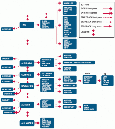 Útpont rögzítésekor különbözo tájelemek listájából választhatjuk ki a pontunkra illo kategóriát. Ennél több nem is kell, mert az óra nyomógombjaival és menürendszerével így is elég körülményes némelyik muvelet, például az új útvonalak összeállítása, vagy útpontok létrehozása. A készülékben 500 útpontot, 25 track-et (800 ponttal) és 50 útvonalat tudunk tárolni. Navigációs üzemmódban TrackBack opciót, pontra navigálást, vagy egy útvonal követését választhatjuk, akárcsak a kézi vevoknél. A kijelzett adattípusok (sebesség, távolság, irány, becsült érkezési ido, stb.) is hasonlóak.